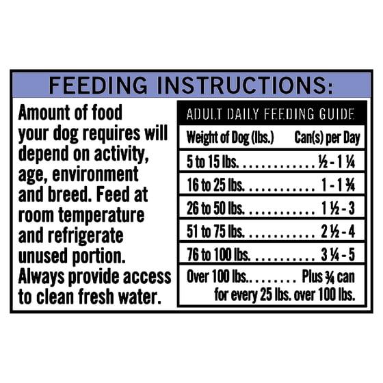 Feeding Instructions: Amount of food your dog requires will depend on activity, age, environment and breed. Feed at room temperature and refrigerate unused portion. Always provide access to clean fresh water. Adult Daily Feeding Guide: Weight of Dog (lbs.): 5 to 15 lbs; Can(s) per Day: 1/2 - 1-1/4. Weight of Dog (lbs.): 16 to 25 lbs; Can(s) per Day: 1 - 1-3/4. Weight of Dog (lbs.): 26 to 50 lbs; Can(s) per Day: 1-1/2 - 3. Weight of Dog (lbs.): 51 to 75 lbs; Can(s) per Day: 2-1/2 - 4. Weight of Dog (lbs.): 76 to 100 lbs; Can(s) per Day: 3-1/4 - 5. Weight of Dog (lbs.): Over 100 lbs; Can(s) per Day: Add 3/4 can for every 25 lbs. over 100 lbs. of body weight.