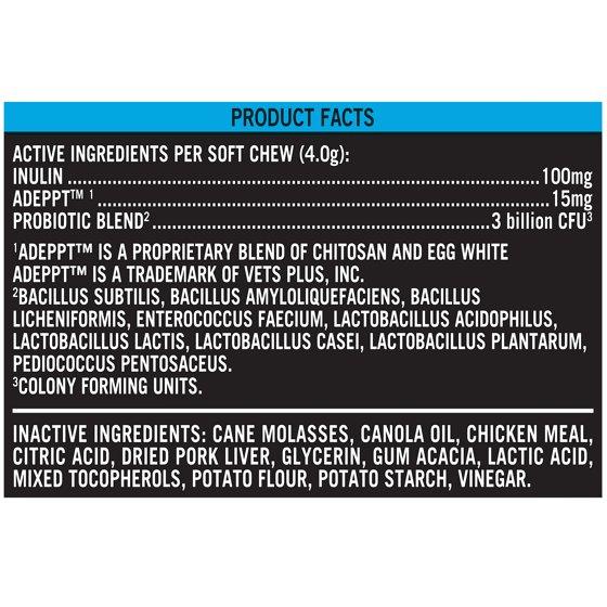 Inulin, Adeppt™, and a Probiotic Blend, CaneMolasses, Canola Oil, Chicken Meal, Citric Acid, Dried Pork Liver, Glycerin, Gum Acaia, Lactic Acid, Mixed Tocopherols, Potato Flour, Potato Starch, Vinegar