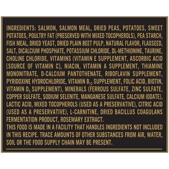 SALMON, SALMON MEAL, DRIED PEAS, POTATOES, SWEET POTATOES, POULTRY FAT (PRESERVED WITH MIXED TOCOPHEROLS), PEA STARCH, FISH MEAL, DRIED YEAST, DRIED PLAIN BEET PULP, NATURAL FLAVOR, FLAXSEED, SALT, DICALCIUM PHOSPHATE, POTASSIUM CHLORIDE, DL-METHIONINE, TAURINE, CHOLINE CHLORIDE, VITAMINS (VITAMIN E SUPPLEMENT, ASCORBIC ACID [SOURCE OF VITAMIN C], NIACIN, VITAMIN A SUPPLEMENT, THIAMINE MONONITRATE, D-CALCIUM PANTOTHENATE, RIBOFLAVIN SUPPLEMENT, PYRIDOXINE HYDROCHLORIDE, VITAMIN B12 SUPPLEMENT, FOLIC ACID, BIOTIN, VITAMIN D3 SUPPLEMENT), MINERALS (FERROUS SULFATE, ZINC SULFATE, COPPER SULFATE, SODIUM SELENITE, MANGANESE SULFATE, CALCIUM IODATE), LACTIC ACID, MIXED TOCOPHEROLS (USED AS A PRESERVATIVE), CITRIC ACID (USED AS A PRESERVATIVE), L-CARNITINE, DRIED BACILLUS COAGULANS FERMENTATION PRODUCT, ROSEMARY EXTRACT. NOTE: THIS FOOD IS MADE IN A FACILITY THAT HANDLES INGREDIENTS NOT INCLUDED IN THIS RECIPE. TRACE AMOUNTS OF OTHER SUBSTANCES FROM AIR, WATER, SOIL OR THE FOOD SUPPLY CHAIN MAY BE PRESENT.