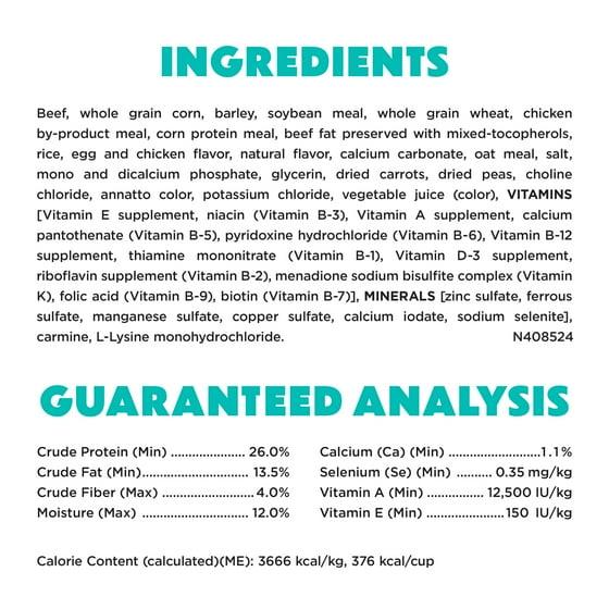 Beef, Whole Grain Corn, Barley, Soybean Meal, Whole Grain Wheat, Chicken By-Product Meal, Corn Protein Meal, Beef Fat Preserved With Mixed-Tocopherols, Rice, Egg And Chicken Flavor, Natural Flavor, Calcium Carbonate, Oat Meal, Salt, Mono And Dicalcium Phosphate, Glycerin, Dried Carrots, Dried Peas, Choline Chloride, Annatto Color, Potassium Chloride, Vegetable Juice (Color), MINERALS [Zinc Sulfate, Ferrous Sulfate, Manganese Sulfate, Copper Sulfate, Calcium Iodate, Sodium Selenite], Vitamin E Supplement, VITAMINS [Vitamin E Supplement, Niacin (Vitamin B-3), Vitamin A Supplement, Calcium Pantothenate (Vitamin B-5), Pyridoxine Hydrochloride (Vitamin B-6), Vitamin B-12 Supplement, Thiamine Mononitrate (Vitamin B-1), Vitamin D-3 Supplement, Riboflavin Supplement (Vitamin B-2), Menadione Sodium Bisulfite Complex (Vitamin K), Folic Acid (Vitamin B-9), Biotin (Vitamin B-7)], Carmine, L-Lysine Monohydrochloride. N408524