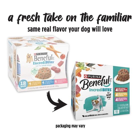 - Purina Beneful Small Breed Wet Dog Food Variety Pack, IncrediBites With Real Beef, Chicken and Salmon is made with real beef, chicken and salmon, and real vegetables and grains you can see.