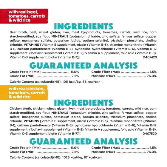 With Real Beef: Beef Broth, Beef, Wheat Gluten, Liver, Meat By-Products, Tomatoes, Carrots, Wild Rice, Corn Starch-Modified, Soy Flour, MINERALS [Potassium Chloride, Zinc Sulfate, Ferrous Sulfate, Copper Sulfate, Manganese Sulfate, Potassium Iodide, Sodium Selenite], Tricalcium Phosphate, Choline Chloride, VITAMINS [Vitamin E Supplement, Niacin (Vitamin B-3), Thiamine Mononitrate (Vitamin B-1), Calcium Pantothenate (Vitamin B-5), Pyridoxine Hydrochloride (Vitamin B-6), Vitamin B-12 Supplement, Riboflavin Supplement (Vitamin B-2), Vitamin A Supplement, Folic Acid (Vitamin B-9), Vitamin D-3 Supplement, Biotin (Vitamin B-7)]. D407420; With Real Chicken: Chicken Broth, Chicken, Wheat Gluten, Liver, Meat By-Products, Tomatoes, Carrots, Wild Rice, Corn Starch-Modified, Soy Flour, MINERALS [Potassium Chloride, Zinc Sulfate, Ferrous Sulfate, Copper Sulfate, Manganese Sulfate, Potassium Iodide, Sodium Selenite], Tricalcium Phosphate, Choline Chloride, VITAMINS [Vitamin E Supplement, Niacin (Vitamin B-3), Thiamine Mononitrate (Vitamin B-1), Calcium Pantothenate (Vitamin B-5), Pyridoxine Hydrochloride (Vitamin B-6), Vitamin B-12 Supplement, Riboflavin Supplement (Vitamin B-2), Vitamin A Supplement, Folic Acid (Vitamin B-9), Vitamin D-3 Supplement, Biotin (Vitamin B-7)]. D407520; With Real Salmon: Chicken Broth, Chicken, Wheat Gluten, Liver, Salmon, Tomatoes, Meat By-Products, Carrots, Wild Rice, Corn Starch-Modified, Soy Flour, Minerals [Potassium Chloride, Zinc Sulfate, Ferrous Sulfate, Copper Sulfate, Manganese Sulfate, Potassium Iodide, Sodium Selenite], Tricalcium Phosphate, Choline Chloride, Vitamins [Vitamin E Supplement, Niacin (Vitamin B-3), Thiamine Mononitrate (Vitamin B-1), Calcium Pantothenate (Vitamin B-5), Pyridoxine Hydrochloride (Vitamin B-6), Vitamin B-12 Supplement, Riboflavin Supplement (Vitamin B-2), Vitamin A Supplement, Folic Acid (Vitamin B-9), Vitamin D-3 Supplement, Biotin (Vitamin B-7)]. D407620
