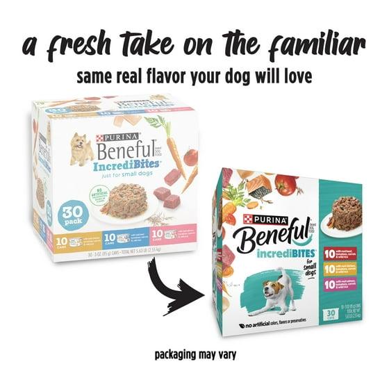 - Purina Beneful Small Breed Wet Dog Food Variety Pack, IncrediBites With Real Beef, Chicken and Salmon is made with real beef, chicken and salmon, and real vegetables and grains you can see.
