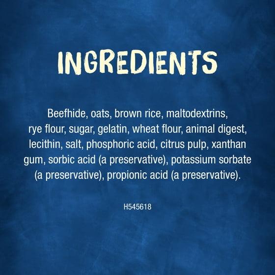 Beefhide, Oats, Brown Rice, Maltodextrins, Rye Flour, Sugar, Gelatin, Wheat Flour, Animal Digest, Lecithin, Salt, Phosphoric Acid, Citrus Pulp, Xanthan Gum, Sorbic Acid (a Preservative), Potassium Sorbate (a Preservative), Propionic Acid (a Preservative), H545618. Beefhide, Oats, Brown Rice, Maltodextrins, Rye Flour, Sugar, Gelatin, Wheat Flour, Animal Digest, Lecithin, Salt, Phosphoric Acid, Citrus Pulp, Xanthan Gum, Sorbic Acid (A Preservative), Potassium Sorbate (A Preservative), Propionic Acid (A Preservative). H545618
