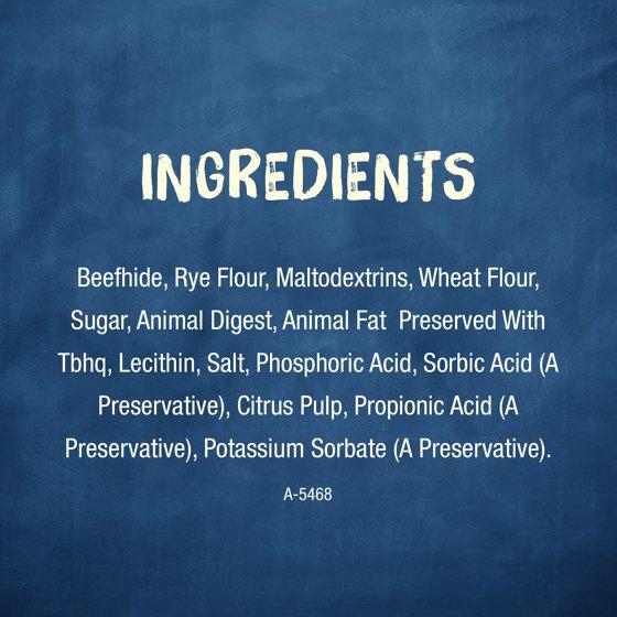 Beefhide, Rye Flour, Maltodextrins, Wheat Flour, Sugar, Animal Digest, Animal Fat Preserved With Tbhq, Lecithin, Salt, Phosphoric Acid, Sorbic Acid (A Preservative), Citrus Pulp, Propionic Acid (A Preservative), Potassium Sorbate (A Preservative). A-5468.