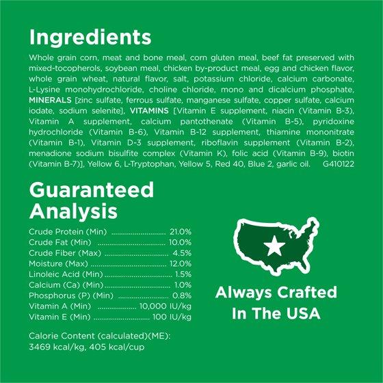 Whole Grain Corn, Meat And Bone Meal, Corn Gluten Meal, Beef Fat Preserved With Mixed-Tocopherols, Soybean Meal, Chicken By-Product Meal, Egg And Chicken Flavor, Whole Grain Wheat, Natural Flavor, Salt, Potassium Chloride, Calcium Carbonate, L-Lysine Monohydrochloride, Choline Chloride, Mono And Dicalcium Phosphate, MINERALS [Zinc Sulfate, Ferrous Sulfate, Manganese Sulfate, Copper Sulfate, Calcium Iodate, Sodium Selenite], VITAMINS [Vitamin E Supplement, Niacin (Vitamin B-3), Vitamin A Supplement, Calcium Pantothenate (Vitamin B-5), Pyridoxine Hydrochloride (Vitamin B-6), Vitamin B-12 Supplement, Thiamine Mononitrate (Vitamin B-1), Vitamin D-3 Supplement, Riboflavin Supplement (Vitamin B-2), Menadione Sodium Bisulfite Complex (Vitamin K), Folic Acid (Vitamin B-9), Biotin (Vitamin B-7)], Yellow 6, L-Tryptophan, Yellow 5, Red 40, Blue 2, Garlic Oil. G410122