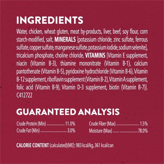 Water, Chicken, Wheat Gluten, Meat By-Products, Liver, Beef, Soy Flour, Corn Starch-Modified, Salt, Minerals [Potassium Chloride, Zinc Sulfate, Ferrous Sulfate, Copper Sulfate, Manganese Sulfate, Potassium Iodide, Sodium Selenite, Tricalcium Phosphate, Choline Chloride, Vitamins [Vitamin E Supplement, Niacin (Vitamin B-3), Thiamine Mononitrate (Vitamin B-1), Calcium Pantothenate (Vitamin B-5), Pyridoxine Hydrochloride (Vitamin B-6), Vitamin B-12 Supplement, Riboflavin Supplement (Vitamin B-2), Vitamin A Supplement, Folic Acid (Vitamin B-9), Vitamin D-3 Supplement, Biotin (Vitamin B-7)]. C412722.