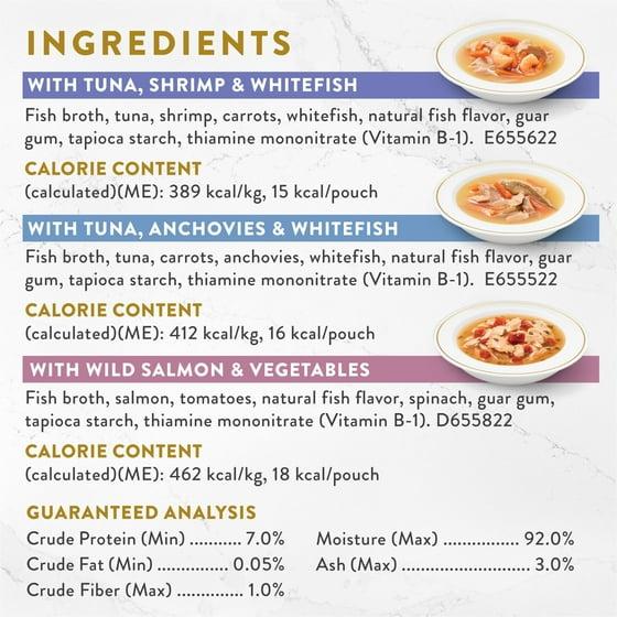 With Tuna, Shrimp & Whitefish In a Decadent Silky Broth: Fish Broth, Tuna, Shrimp, Carrots, Whitefish, Natural Fish Flavor, Guar Gum, Tapioca Starch, Thiamine Mononitrate (Vitamin B-1). With Tuna, Anchovies & Whitefish in a Decadent Silky Broth: Fish Broth, Tuna, Carrots, Anchovies, Whitefish, Natural Fish Flavor, Guar Gum, Tapioca Starch, Thiamine Mononitrate (Vitamin B-1). With Wild Salmon & Vegetables in a Decadent Silky Broth: Fish Broth, Salmon, Tomatoes, Natural Fish Flavor, Spinach, Guar Gum, Tapioca Starch, Thiamine Mononitrate (Vitamin B-1).