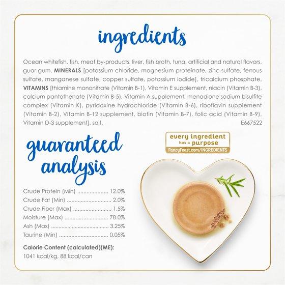 Ocean Whitefish, Fish, Meat By-Products, Liver, Fish Broth, Tuna, Artificial and Natural Flavors, Guar Gum, Minerals [Potassium Chloride, Magnesium Proteinate, Zinc Sulfate, Ferrous Sulfate, Manganese Sulfate, Copper Sulfate, Potassium Iodide], Tricalcium Phosphate, Vitamins [Thiamine Mononitrate (Vitamin B-1), Vitamin E Supplement, Niacin (Vitamin B-3), Calcium Pantothenate (Vitamin B-5), Vitamin A Supplement, Menadione Sodium Bisulfite Complex (Vitamin K), Pyridoxine Hydrochloride (Vitamin B-6), Riboflavin Supplement (Vitamin B-2), Vitamin B-12 Supplement, Biotin (Vitamin B-7), Folic Acid (Vitamin B-9), Vitamin D-3 Supplement], Salt. E667522.