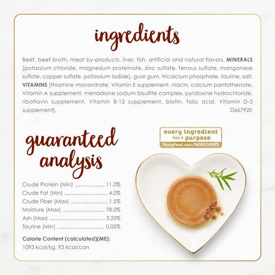 Beef, Beef Broth, Meat By-products, Liver, Fish, Artificial And Natural Flavors, Minerals [Potassium Chloride, Magnesium Proteinate, Zinc Sulfate, Ferrous Sulfate, Manganese Sulfate, Copper Sulfate, Potassium Iodide], Guar Gum, Tricalcium Phosphate, Taurine, Salt, Vitamins [Thiamine Mononitrate, Vitamin E Supplement, Niacin, Calcium Pantothenate, Vitamin A Supplement, Menadione Sodium Bisulfite Complex, Pyridoxine Hydrochloride, Riboflavin Supplement, Vitamin B-12 Supplement, Biotin, Folic Acid, Vitamin D-3 Supplement]. D667920