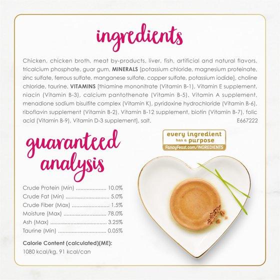 Chicken, Poultry Broth, Liver, Meat By-Products, Fish, Artificial And Natural Flavors, Tricalcium Phosphate, Guar Gum, Added Color, Salt, Minerals [Potassium Chloride, Magnesium Sulfate, Zinc Sulfate, Ferrous Sulfate, Copper Sulfate, Manganese Sulfate, Potassium Iodide], Taurine, Vitamins [Thiamine Mononitrate (Vitamin B-1), Vitamin E Supplement, Niacin (Vitamin B-3), Calcium Pantothenate (Vitamin B-5), Vitamin A Supplement, Menadione Sodium Bisulfite Complex (Vitamin K), Pyridoxine Hydrochloride (Vitamin B-6), Riboflavin Supplement (Vitamin B-2), Vitamin B-12 Supplement, Biotin (Vitamin B-7), Folic Acid (Vitamin B-9), Vitamin D-3 Supplement], Sodium Nitrite (To Promote Color Retention). D-6672.
