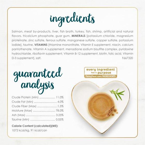 Salmon, Meat By-products, Liver, Fish Broth, Turkey, Fish, Shrimp, Artificial And Natural Flavors, Tricalcium Phosphate, Guar Gum, Minerals [Potassium Chloride, Magnesium Proteinate, Zinc Sulfate, Ferrous Sulfate, Manganese Sulfate, Copper Sulfate, Potassium Iodide], Taurine, Vitamins [Thiamine Mononitrate, Vitamin E Supplement, Niacin, Calcium Pantothenate, Vitamin A Supplement, Menadione Sodium Bisulfite Complex, Pyridoxine Hydrochloride, Riboflavin Supplement, Vitamin B-12 Supplement, Biotin, Folic Acid, Vitamin D-3 Supplement], Salt. F667320