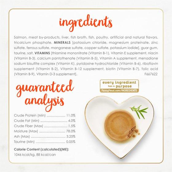 Salmon, Meat By-products, Liver, Fish Broth, Fish, Poultry, Artificial And Natural Flavors, Tricalcium Phosphate, Minerals [Potassium Chloride, Magnesium Proteinate, Zinc Sulfate, Ferrous Sulfate, Manganese Sulfate, Copper Sulfate, Potassium Iodide], Guar Gum, Taurine, Salt, Vitamins [Thiamine Mononitrate (Vitamin B-1), Vitamin E Supplement, Niacin (Vitamin B-3), Calcium Pantothenate (Vitamin B-5), Vitamin A Supplement, Menadione Sodium Bisulfite Complex (Vitamin K), Pyridoxine Hydrochloride (Vitamin B-6), Riboflavin Supplement (Vitamin B-2), Vitamin B-12 Supplement, Biotin (Vitamin B-7), Folic Acid (Vitamin B-9), Vitamin D-3 Supplement]. F667622
