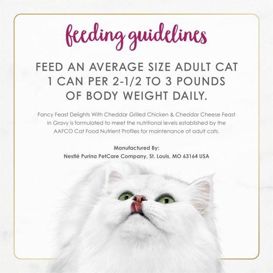 - An irresistible, gravy-enhanced Fancy Feast wet cat food grilled chicken taste experience featuring an enticing aroma and a cat-pleasing cheddar flavor