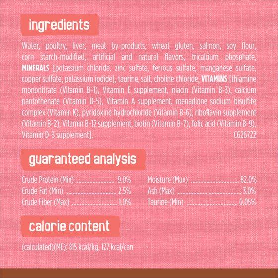 Water, Poultry, Liver, Meat By-Products, Wheat Gluten, Salmon, Soy Flour, Corn Starch-Modified, Artificial And Natural Flavors, Tricalcium Phosphate, MINERALS [Potassium Chloride, Zinc Sulfate, Ferrous Sulfate, Manganese Sulfate, Copper Sulfate, Potassium Iodide], Taurine, Salt, Choline Chloride, VITAMINS [Thiamine Mononitrate (Vitamin B-1), Vitamin E Supplement, Niacin (Vitamin B-3), Calcium Pantothenate (Vitamin B-5), Vitamin A Supplement, Menadione Sodium Bisulfite Complex (Vitamin K), Pyridoxine Hydrochloride (Vitamin B-6), Riboflavin Supplement (Vitamin B-2), Vitamin B-12 Supplement, Biotin (Vitamin B-7), Folic Acid (Vitamin B-9), Vitamin D-3 Supplement]. C626722