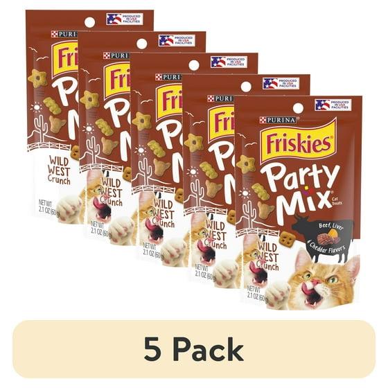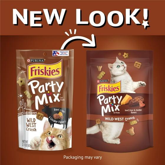 - Purina Friskies Party Mix Wild West Crunch adult treats for cats are quality and safety checked in Purina's facilities. Packaged in a resealable pouch for freshness
