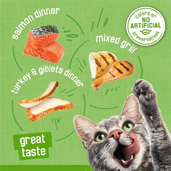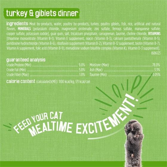Make your cat's mouth water when you serve up a can from this Purina Friskies Wet Cat Food Pate Variety Pack Salmon, Turkey and Giblets Mixed Grill. Each package contains Pate Salmon, Pate Turkey and Giblets, and Pate Mixed Grill canned cat food pate recipes, all with a tender cat food wet pate texture she loves. Every serving from this Friskies wet cat food variety pack provides vitamins and minerals, delivering 100 percent complete and balanced nutrition for adult cats and letting you feel good about the foods you put in her dish. The delectable Friskies cat food flavor combinations satisfy her desires for savory poultry and delicate seafood. Purina believes that life is better with pets, and they know you want only the best for your cat. That's why Purina uses high-quality ingredients in every serving and strives to make quality the top priority in everything they produce. This Friskies wet cat food is formulated to meet or exceed industry standards for cat foods, so you can feel confident she's getting the delicious, nutritious meals you expect from a trusted brand. Each batch undergoes rigorous quality and safety checks at every step in the production process to give you added peace of mind. Sustainability is a core concept at Purina, and they see that commitment through by seeking out responsibly sourced ingredients and eco-friendly product packaging when possible. Every can in this Friskies wet cat food collection is recyclable, helping you to do your part for the environment while giving your cat the tasty meals she craves. Offer up a serving from this Purina Friskies wet canned cat food Pate variety pack at mealtime and show your cat just how much you care about her health and happiness.