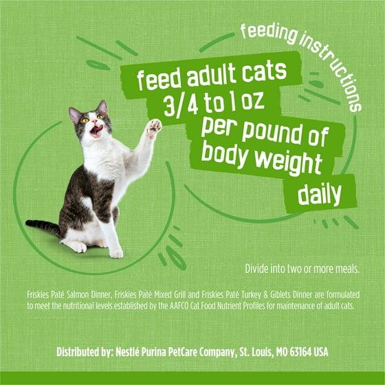 - 4 - Salmon dinner. 4 - Mixed grill. 4 - Turkey & giblets dinner. Includes all essential nutrients that support the maintenance of adult cats. Protein: Strong, lean muscles supported by high-quality protein. Taurine: Helps support clear, healthy vision. Purina.com. how2recycle.info. how2recycle.info. Printed in USA. Keep your pantry filled with this Purina Friskies Pate wet cat food variety pack, and let your cat select her favorite flavors for every feeding. Chicken, turkey and seafood options deliver all the tastes she craves, and the smooth pate texture found in every can is pleasing to her palate. Let the fragrant aroma of each recipe lead her to her dish in anticipation of a mouthwatering meal, and watch as she happily savors every nibble. Each serving is 100 percent complete and balanced for adult cats, providing the important nutrients she needs to help support her overall health and wellness. This 24-count package makes it easy to offer your cat companion the flavors she adores. Offer your feline friend a different selection from this variety pack at every feeding, and surprise her taste buds with the yummy flavor and wholesome goodness found in each can.; Make your cat's mouth water when you serve up a can from this Purina Friskies Pate wet cat food variety pack. Each package contains Pate Salmon Dinner, Pate Turkey and Giblets Dinner, and Pate Mixed Grill, all with a tender, moist pate texture she loves. Every serving provides vitamins and minerals, delivering 100 percent complete and balanced nutrition for adult cats and letting you feel good about the foods you put in her dish. The delectable flavor combinations satisfy her desires for savory poultry and delicate seafood. Make the selections from this variety pack part of her daily diet, and let her explore our other tempting recipes, including Purina Friskies Tender and Crunchy Combo dry cat food for even more variety in her diet. We believe that life is better with pets, and we know you want only the best for your cat. That's why we use high-quality ingredients in every serving, and we strive to make quality the top priority in everything we produce. This wet cat food is formulated to meet or exceed industry standards for cat foods, so you can feel confident she's getting the delicious, nutritious meals you expect from a trusted brand. Each batch undergoes rigorous quality and safety checks at every step in the production process to give you added peace of mind. Sustainability is a core concept at Purina, and we see that commitment through by seeking out responsibly sourced ingredients and eco-friendly product packaging when possible. Every can in this wet cat food collection is recyclable, helping you to do your part for the environment while giving your cat the tasty meals she craves. Offer up a serving from this Purina Friskies Pate wet cat food variety pack at mealtime, and show your cat just how much you care about her health and happiness.; Introduce your cat to a collection of delicious flavors with this Purina Friskies Pate adult wet cat food variety pack. Each pack offers four cans each of three cat-approved flavors.