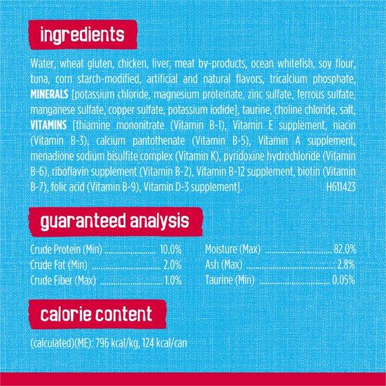 Water, Wheat Gluten, Chicken, Liver, Meat By-Products, Ocean Whitefish, Soy Flour, Tuna, Corn Starch-Modified, Artificial And Natural Flavors, Tricalcium Phosphate, MINERALS [Potassium Chloride, Magnesium Proteinate, Zinc Sulfate, Ferrous Sulfate, Manganese Sulfate, Copper Sulfate, Potassium Iodide], Taurine, Choline Chloride, Salt, VITAMINS [Thiamine Mononitrate (Vitamin B-1), Vitamin E Supplement, Niacin (Vitamin B-3), Calcium Pantothenate (Vitamin B-5), Vitamin A Supplement, Menadione Sodium Bisulfite Complex (Vitamin K), Pyridoxine Hydrochloride (Vitamin B-6), Riboflavin Supplement (Vitamin B-2), Vitamin B-12 Supplement, Biotin (Vitamin B-7), Folic Acid (Vitamin B-9), Vitamin D-3 Supplement]. H611423