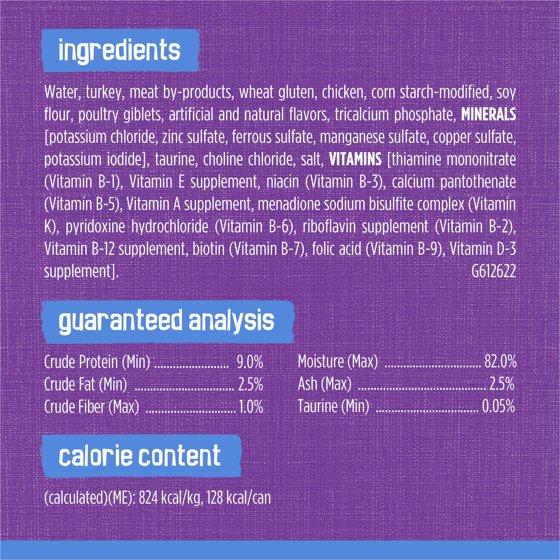 Water, Turkey, Meat By-Products, Wheat Gluten, Chicken, Corn Starch-Modified, Soy Flour, Poultry Giblets, Artificial And Natural Flavors, Tricalcium Phosphate, MINERALS [Potassium Chloride, Zinc Sulfate, Ferrous Sulfate, Manganese Sulfate, Copper Sulfate, Potassium Iodide], Taurine, Choline Chloride, Salt, VITAMINS [Thiamine Mononitrate (Vitamin B-1), Vitamin E Supplement, Niacin (Vitamin B-3), Calcium Pantothenate (Vitamin B-5), Vitamin A Supplement, Menadione Sodium Bisulfite Complex (Vitamin K), Pyridoxine Hydrochloride (Vitamin B-6), Riboflavin Supplement (Vitamin B-2), Vitamin B-12 Supplement, Biotin (Vitamin B-7), Folic Acid (Vitamin B-9), Vitamin D-3 Supplement]. G612622