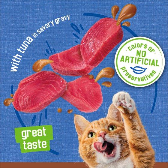 Unleash your cat's sense of adventure with the irresistible taste of the extra gravy in this Purina Friskies Gravy Pate Wet Cat Food, Extra Gravy Pate With Tuna in Savory Gravy Cat Food. This moist cat food recipe is made with real tuna and features a delicious taste that's swimming in extra gravy to dial up the yum factor at mealtime while offering your cat healthy hydration. The smooth Friskies canned cat food pate texture lets her choose the perfect bite-sized nibbles for her small mouth as she dines while the gravy-licious flavor encourages her to lick the bowl clean so she can have plenty of energy to play and explore her world with you every day. Including 100 percent complete and balanced nutrition, this soft cat food includes essential vitamins and minerals and no artificial colors or preservatives. Plus, you can rest assured that this Friskies extra gravy cat food is crafted in Purina-owned facilities and backed by a trusted name in pet nutrition. Your cat deserves delicious-tasting, nutrient-rich Friskies cat food meals that will fuel her on her daily adventures, so feed her Purina Friskies Gravy Pate Wet Cat Food, Extra Gravy Pate With Tuna in Savory Gravy Cat Food. Make mealtime more exciting for both of you when you let your cat try out the entire line of Purina Friskies wet and dry cat foods and take her on a daily culinary exploration.