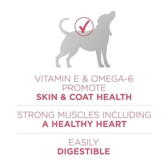 Purina One +Plus Dry Dog Food Skin and Coat Formula, Give your dog a SmartBlend of ingredients at every meal with Purina ONE +Plus Natural Skin Coat Formula with added vitamins, minerals and nutrients adult dry dog food. This high protein dog food features real salmon as the #1 ingredient, and when combined with rice, oatmeal and other high-quality ingredients, delivers easy-to-digest nutrition for your dog. Developed to deliver 100% complete and balanced nutrition for adult dogs, our salmon natural dog food recipe has no artificial colors, flavors or preservatives and 0% fillers.