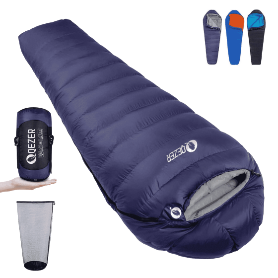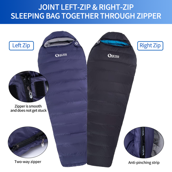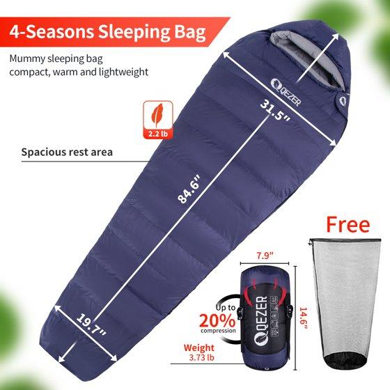 QEZER 4 Season Mummy Down Sleeping Bag Ultralight Warm for Camping, Hiking, Trekking