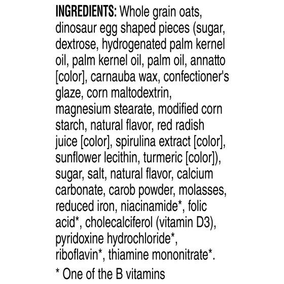 Whole Grain Oats, Dinosaur Egg Shaped Pieces (Sugar, Dextrose, Hydrogenated Palm Kernel Oil, Palm Kernel Oil, Palm Oil, Annatto [Color], Carnauba Wax, Confectioner's Glaze, Corn Maltodextrin, Magnesium Stearate, Modified Corn Starch, Natural Flavor, Red Radish Juice [Color], Spirulina Extract [Color], Sunflower Lecithin, Turmeric [Color]), Sugar, Salt, Natural Flavor, Calcium Carbonate, Molasses, Reduced Iron, Niacinamide (One of the B Vitamins), Folic Acid (One of the B Vitamins), Cholecalciferol (Vitamin D3), Pyridoxine Hydrochloride (One of the B Vitamins), Riboflavin (One of the B Vitamins), Thiamin Mononitrate (One of the B Vitamins).