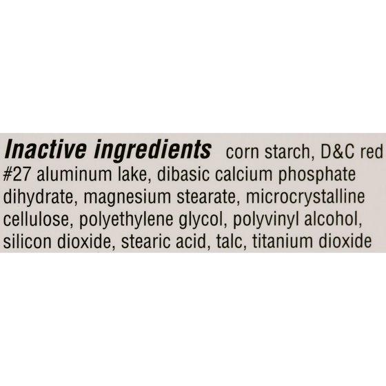 Corn starch, D&C red #27 aluminum lake, dicalcium phosphate, magnesium stearate, microcrystalline cellulose, polyethylene glycol, polyvinyl alcohol, silicon dioxide, stearic acid, talc, titanium dioxide