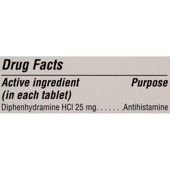 Diphenhydramine HCI (25 mg), Corn Starch, D&C Red 27 Aluminum Lake, Dicalcium Phosphate, Magnesium Stearate, Microcrystalline Cellulose, Polyethylene Glycol, Polyvinyl Alcohol, Silicon Dioxide, Stearic Acid, Talc, Titanium Dioxide.