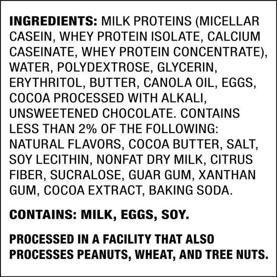 Milk Proteins (Micellar Casein, Whey Protein Isolate, Calcium Caseinate, Whey Protein Concentrate), Water, Polydextrose, Glycerin, Erythritol, Butter, Canola Oil, Eggs, Cocoa Processed with Alkali, Unsweetened Chocolate, Contains Less than 2% of the Following: Natural Flavors, Cocoa Butter, Salt, Soy Lecithin, Nonfat Dry Milk, Citrus Fiber, Sucralose, Guar Gum, Xanthan Gum, Cocoa Extract, Baking Soda.