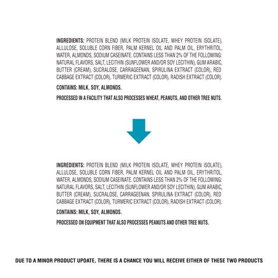 Protein Blend (Milk Protein Isolate, Whey Protein Isolate), Allulose, Soluble Corn Fiber, Palm Kernel Oil and Palm Oil Erythritol, Water, Almonds, Sodium Caseinate, Contains Less than 2% of the Following: Natural Flavors, Salt, Lecithin (Sunflower and/or Soy Lecithin), Gum Arabic, Butter (Cream), Sucralose, Carrageenan, Spirulina Extract (Color), Red Cabbage Extract (Color), Turmeric Extract (Color), Radish Extract (Color).
