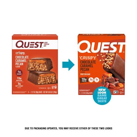- Box contains 4 Crispy Chocolate Caramel Pecan flavored Quest Hero Protein Bars.