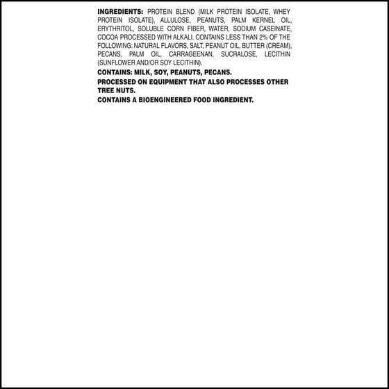 Protein Blend (Milk Protein Isolate, Whey Protein Isolate), Allulose, Palm Kernel Oil, Peanuts, Erythritol, Soluble Corn Fiber, Water, Sodium Caseinate, Cocoa Processed with Alkali. Contains Less than 2% of the Following: Natural Flavors, Sea Salt, Peanut Oil, Butter (Cream), Pecans, Palm Oil, Carrageenan, Sucralose, Lecithin (Sunflower and/or Soy Lecithin).