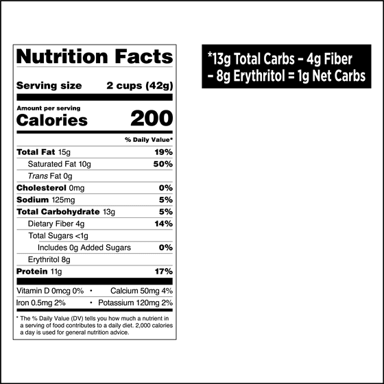 Whey Protein Isolate, Erythritol, Unsweetened Chocolate, Cocoa Butter, Peanuts, Palm Kernel Oil, Soluble Corn Fiber, Sodium Caseinate. Contains less than 2% of the following: Lecithin (Sunflower and/or Soy Lecithin), Sea Salt, Butterfat, Natural Flavor, Peanut Oil, Sucralose.