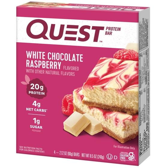 - Box contains 4 White Chocolate Raspberry flavored Quest Protein Bars