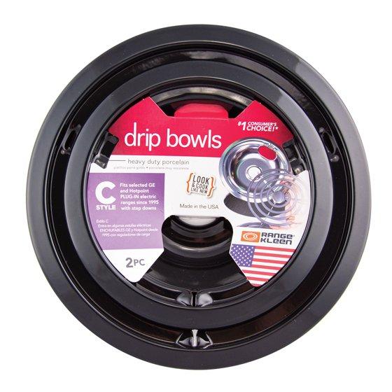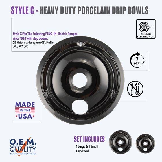 - Includes one small and one large Style C, Heavy Duty Black Porcelain Plated Drip Bowl for your electric range