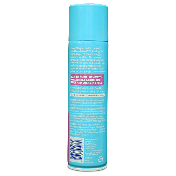 The signature hold you love combined with the new anti-humidity formula, this product with ClimaShield keeps hair in place and your style in control. Vitamin-enhanced formula lightly conditions hair and boosts the body, without being stiff or sticky. Rave provides the durable hold you expect for both curly and straight hair but also delivers maximum performance at high humid conditions as well as minimizes the effect of static electricity. Be prepared for whatever mother nature throws you the way - rain or shine - in hot or cold water. No CFCs. Up to 90% relative humidity.