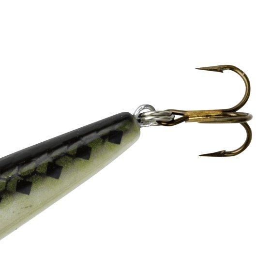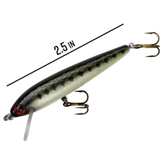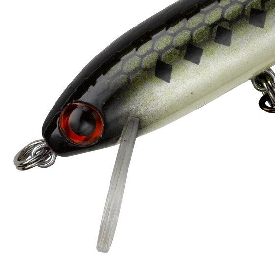 Perfect for small waters, streams, ponds and shallow water in general, the Rebel Minnow catches any fish in the water. The Rebel F50 Minnow is 2 1/2-inches long and weighs 1/8 of an ounce. It cranks down to 2 feet - perfect for shallow water fishing. When paused, it slowly floats back to the surface.