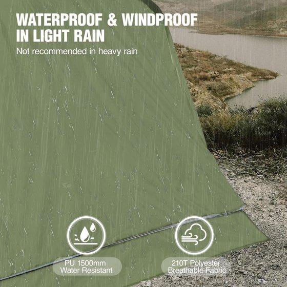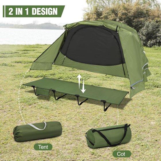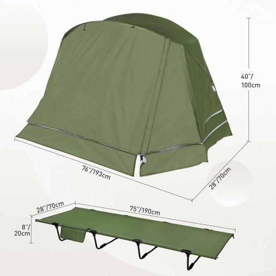 - 1 Person Size: 1-person camping beds and tents are suitable for single person to lie down and sleep. The size is 75”x28”x8”/190x70x20cm(camping bed) and 76”x28”x40”/193x70x100cm(camping tent). They can all be disassembled for easy carrying out and no tools need to be installed.