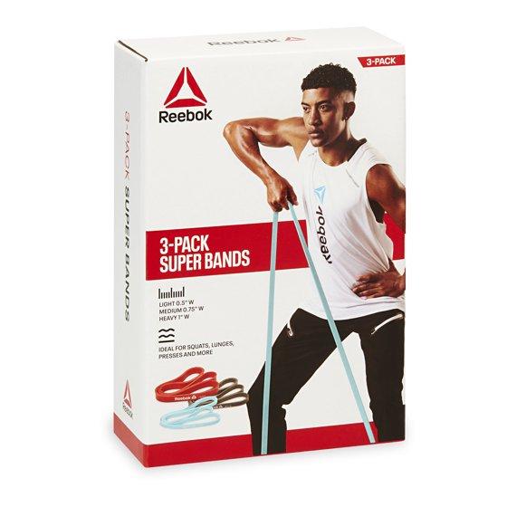 - Includes: Reebok Super Band Kit 3-Pack, Three Resistance Levels, Extra-Strong Closed Loop Design, And Exercise Guide