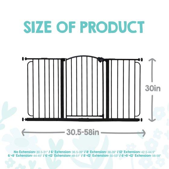 Keep little ones safely contained with the Regalo Arched Décor Baby Safety Gate, a stylish and secure solution for busy homes with crawling babies and toddlers. Made with a durable metal frame and an elegant arched design, this gate blends into your home while helping block off doorways, hallways, and open spaces. Designed for an extra wide adjustable fit, it expands to fit openings 30.5” to 58” wide. Choose the installation method that works best for your home. Use the pressure-mount option with rubberized tension knobs for quick setup, or hardware mount for added security and stability. Ideal for everyday childproofing and also great for pets.