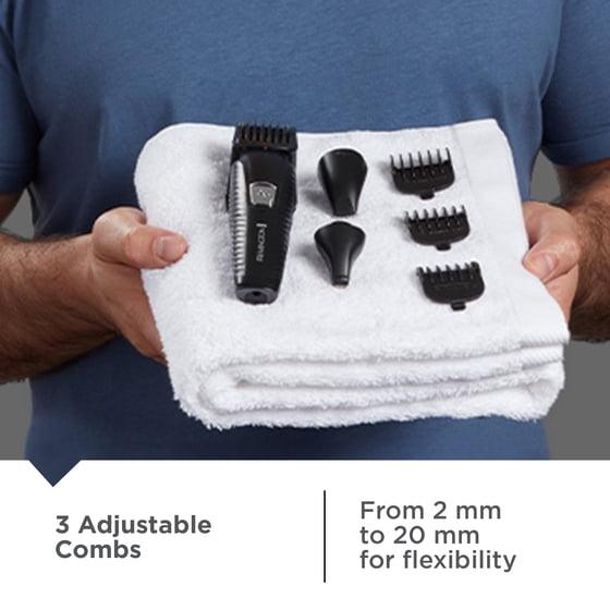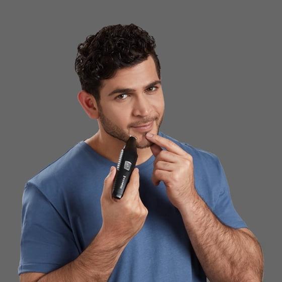 Note: this product is for cordless use only. • Switch the product on by sliding the On/Off switch upward. TO ATTACH AND REMOVE THE TRIMMING ATTACHMENTS Note: Always ensure the groomer is switched off before changing any attachments. • To attach, place the desired trimming head on top of the groomer and rotate clockwise to lock into place. • To remove, rotate the trimmer head counter-clockwise until it unlocks and then lift off the groomerATTACHING AND REMOVING FIXED GUIDE COMBS ON THE WIDE TRIMMER BLADE To Attach • With the trimmer blade facing away from you, hook front of comb onto blade teeth and pivot back end down until it clicks into position. To Remove • With the trimmer blade facing away from you, carefully push the tab on the back of the guide comb upwards and away from the trimmer blade. ATTACHING AND REMOVING ADJUSTABLE COMB ON THE WIDE TRIMMER BLADE • To attach line up the comb rails and slot on the groomer until firmly secured. Pressing the adjustment button on the back of the comb will alter the cutting length increment, this is indicated on the comb. • To remove press and hold the adjustment button and push the comb up and off the groomer. BEFORE YOU BEGIN • Comb facial hair with a fine comb before you start trimming. • Hairs should be dry and without any waxes or lotions before using the groomer. TO THIN AND TAPER THE BEARD/MOUSTACHE • Attach the wide trimmer blade. • Place either the adjustable comb or a fixed comb on the trimmer blade, select the desired length and switch on. • Start trimming under the chin, following the jawbone line. Work toward the ear and upper beard line using an upward motion. TO TRIM EDGE OF BEARD OR MOUSTACHE • Attach the trimmer blade. • Hold the groomer with the cutting blade facing you. • Start with edge of beard/moustache line, and with the cutting blades resting lightly against your skin, use slow movements to create a beard/moustache line. TO TRIM SIDEBURNS • Hold the groomer with the cutting blade facing you. • Select the desired length on the adjustable comb or select the desired guide combs. • Use light pressure and well-controlled movements to trim hair. TRIMMING THE NAPE OF YOUR NECK • Attach the trimmer blade. • Use your fingers to lift the hair at the base of your head up off the neck. Your index finger should be covering the roots of the hairs you are lifting to prevent accidental removal by trimmer. • Using your other hand, hold the trimmer to the base of your neck with the cutting unit facing up, and move the trimmer up the length of the neck until it touches your finger covering the hair roots at the base of your head. • Be sure to move the unit slowly when performing this operation and to keep the hair roots at the base of your head out of the way of the trimmer. TO REMOVE HAIR FROM NOSE AND EAR • Attach the nose, ear, eyebrow attachment. • Insert the groomer’s cutting unit gently into the nostril or ear. • Gently move the groomer in and out of the nostril or ear. • Avoid inserting the cutting unit more than 6mm into your nostril. TO REMOVE HAIR FROM EYEBROWS • Attach the nose, ear, eyebrow attachment. • Gently guide the cutting unit to stray, unwanted hairs along the eyebrow line or protruding from the eyebrow itself. • To remove the hairs completely lower onto the skin and move over desired area. • Use short, well-controlled movements. USING THE DETAIL ATTACHMENT • Hold the groomer with the cutting blade facing you. • Rest cutting blades lightly on the skin. • Use for more precise trimming of stray hairs or smaller areas. TIPS FOR BEST RESULTS • Comb your hair in the direction that it grows so that the hairs are at their maximum height and facing in the same direction. • Since all hairs do not grow in the same direction, you may want to try different trimming positions (i.e. upwards, downwards or across) for better results.
