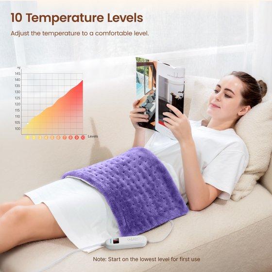- Product Specifications:Color: White PurpleSize: 12” x 24”Temperature Range: 104°F – 140°FTimer Range: 0.5 – 2 hoursRated Power: 85W, 120VIncludes: Heating Pad, Power Cord with Controller, User Manual