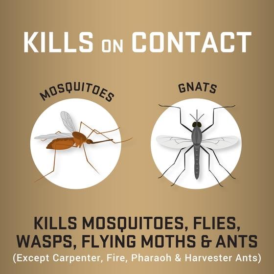 - KILLS FLYING AND CRAWLING INSECTS AS LISTED: Also kills annoying gnats, flies, wasps, flying moths and ants (except carpenter, pharaoh and harvester ants).