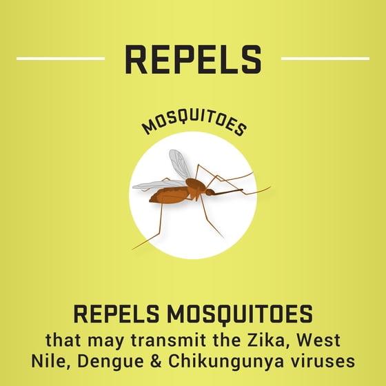 - REPELS MOSQUITOES: Repels mosquitoes that may transmit the Zika, West Nile, Dengue and Chikungunya viruses.