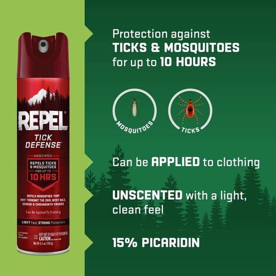 Outdoor enthusiasts know that when the going gets tough, so should their insect repellent. However extreme the activity or terrain, there's a Repel insect repellent designed to offer dependable coverage that lasts as long as you need it to. Repel products make effective mosquito protection simple under any circumstance- so you can heed the call of the wild wherever the trail takes you. Repel Tick Defense repels ticks and mosquitoes for up to 10 hours, providing you with lasting protection as you explore the outdoors. With 15% Picaridin, this repellent can also be applied to your clothing for full coverage. It will not damage cotton, wool, nylon, acetate or spandex. Enjoy strong protection that feels light on your skin and clothes, leaving no scent behind. Create a barrier against annoying bugs that can bring a halt to your outdoor adventures with our Repel Tick Defense Aerosol Spray with 15% Picaridin.