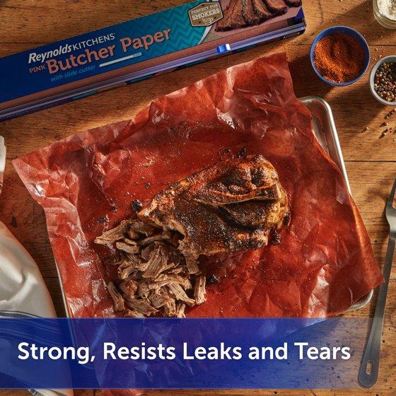 Reynolds Kitchens Pink Butcher Paper with Slide Cutter helps ensure your smoked brisket and pork turn out juicy and tender while retaining a crisp outer bark. Wrapping meats for the last stage of smoking seals in moisture and protects smoked meat from getting too dark or overly smoky. Breathable butcher paper allows steam to escape, which helps retain the hard earned, slightly crunchy exterior. This unbleached, unwaxed, 40lb pink butcher paper for smoking meat is FDA compliant, tested for temperatures up to 300°F and certified by the Sustainable Forestry Initiative. Perfect for smoking meat, Reynolds Kitchens Butcher Paper for smoking meat is strong when wet and resists leaks and tears. You’ll feel like a pit boss when you prep, wrap and serve your smoked feast like a barbecue pro on pink butcher paper. Also great for wrapping gifts, creating signs and art projects.