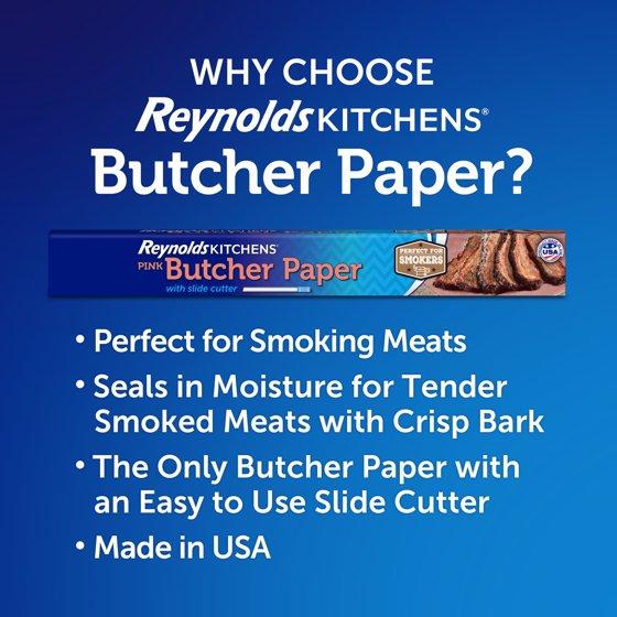 Reynolds Kitchens Pink Butcher Paper with Slide Cutter helps ensure your smoked brisket and pork turn out juicy and tender while retaining a crisp outer bark. Wrapping meats for the last stage of smoking seals in moisture and protects smoked meat from getting too dark or overly smoky. Breathable butcher paper allows steam to escape, which helps retain the hard earned, slightly crunchy exterior. This unbleached, unwaxed, 40lb pink butcher paper for smoking meat is FDA compliant, tested for temperatures up to 300°F and certified by the Sustainable Forestry Initiative. Perfect for smoking meat, Reynolds Kitchens Butcher Paper for smoking meat is strong when wet and resists leaks and tears. You’ll feel like a pit boss when you prep, wrap and serve your smoked feast like a barbecue pro on pink butcher paper. Also great for wrapping gifts, creating signs and art projects.