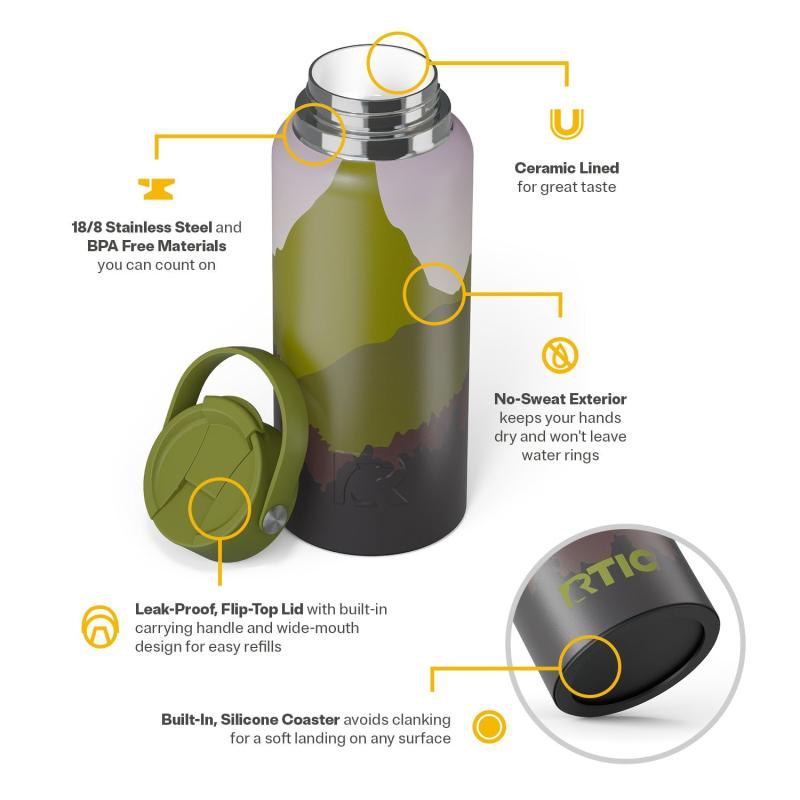 RTIC 32 oz Ceramic Lined Insulated Outback Water Bottle, Leak Resistant, Deep Woods